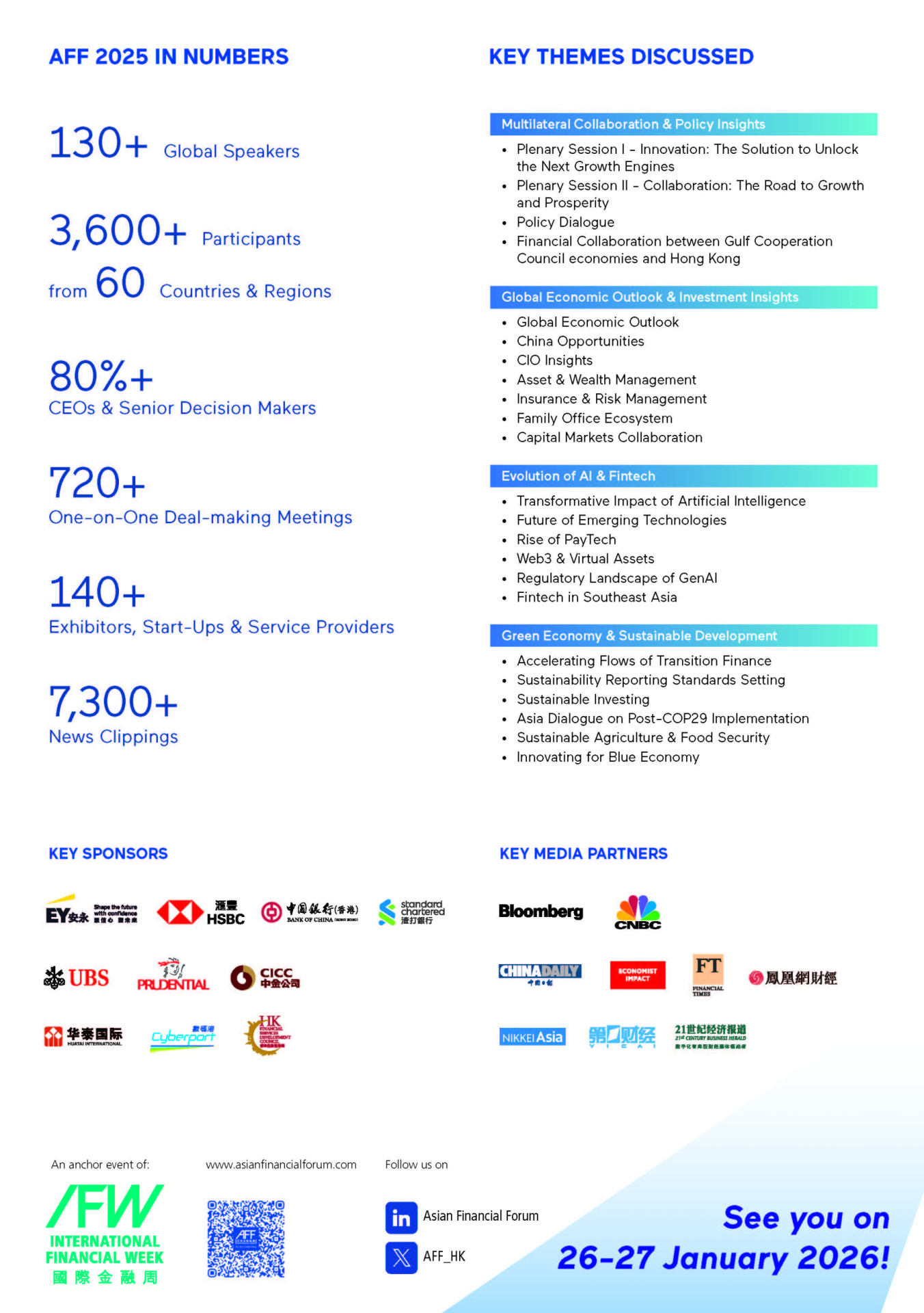 The Asian Financial Forum (AFF) is the region’s premier platform that brings together influential leaders from government, finance, and business communities globally for ground-breaking discussions and exchange of insights on the global economy from an Asian perspective. The AFF 2025 convened over 130 elite speakers from around the world and attracted over 3,600 visitors from 60 countries and regions, including over 70 overseas and Mainland China delegations, participating for thought leadership and discussions while witnessing the latest fintech advancements, emerging business strategies, and expanding their professional networks.