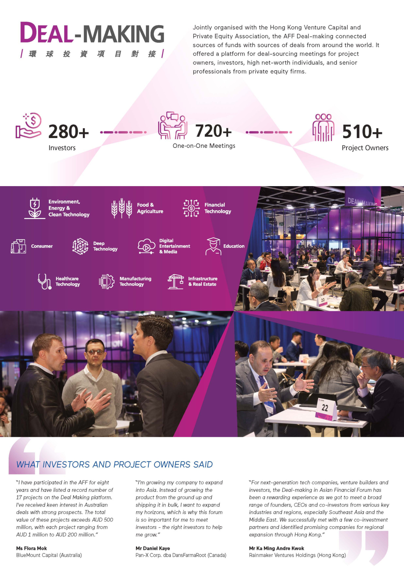 As an integral part of the forum, the Deal-Making facilitates one-to-one meetings between sources of funds and sources of deals, enabling participants to meet with potential business partners from around the world. At AFF 2025, over 720 meetings were arranged for over 560 project owners and over 280 investors in various sectors, including fintech, environment, energy & clean tech, food & agriculture, healthcare tech, deep tech, infrastructure & real estate and more.