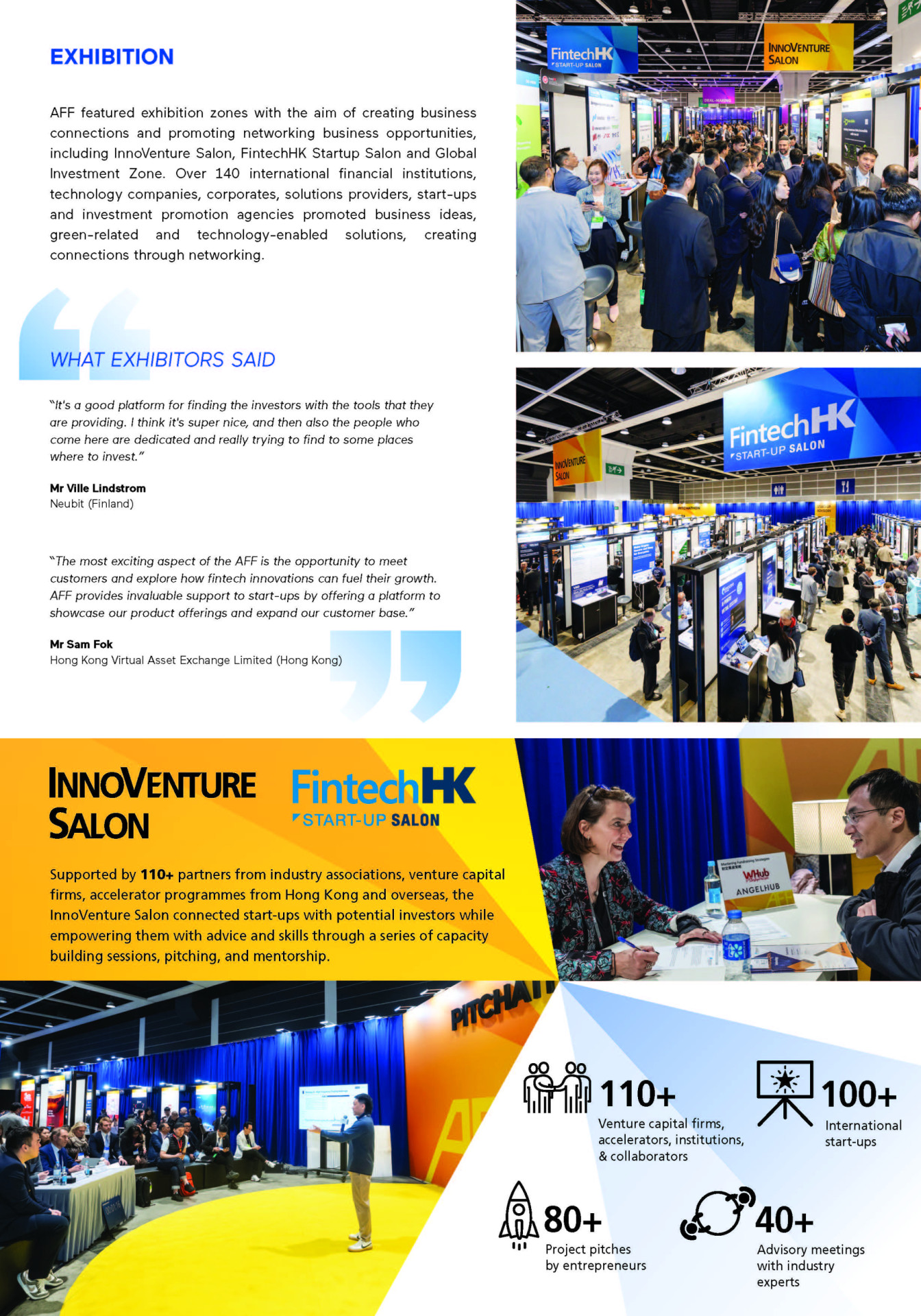 Fintech Showcase, InnoVenture Salon, FintechHK Startup Salon and other themed zones brought together over 140 exhibitors, including international financial institutions, technology companies, start-ups, investment promotion agencies, and sponsors, showcasing a wide range of financial innovations, advanced solutions, and revolutionary business ideas aimed at promoting business collaboration and empowering entrepreneurs and startups.