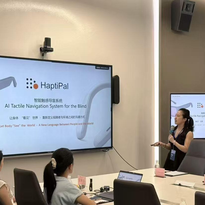 如今,HaptiPal 已斩获 “春晖杯中瑞创新创业大赛” 瑞士赛区冠军,入选香港科学园(HKSTP Co-Ideation)计划,正全力推进临床级验证。王金花的目标清晰而坚定:“未来三年,我们要让听障、视障朋友通过触觉,实现自由、安全的行走 --- 不用再依赖他人搀扶,不用再担心‘看不见’‘听不见’的风险,能像普通人一样,感受风的方向、路的平坦,用自己的方式‘看见’这个世界。”