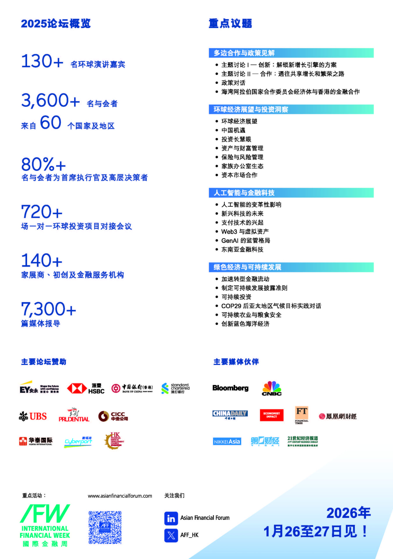 亚洲金融论坛(AFF)由香港特别行政区政府及香港贸易发展局合办,滙聚来自全球政府丶金融和商业界领袖,分享就全球经济对亚洲金融和商业界带来机会和挑战的真知灼见。AFF 2025匯聚全球超过130名重量级演讲嘉宾,吸引逾3,600名来自60个国家和地区的观众,包括70多个海外及中国大陆代表团,共同探索引导思维和讨论,同时见证了最新的金融科技进展丶新兴的商业策略交流并扩展人脉网络。